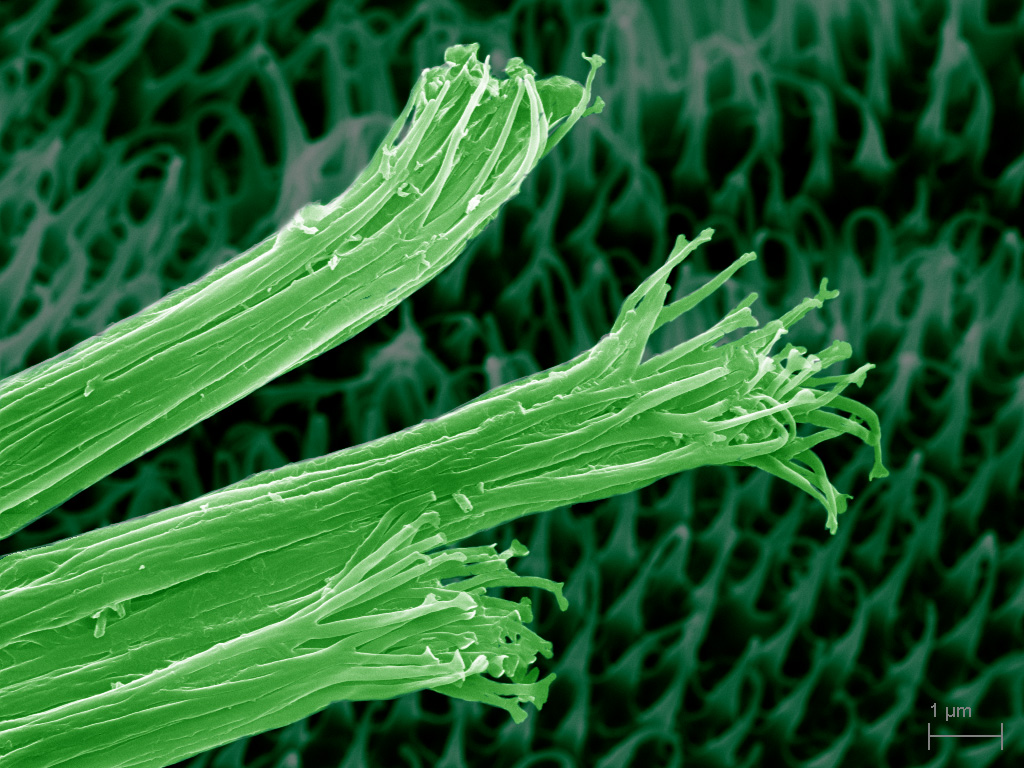 These remarkable changes provide exciting opportunities for traditional businesses to develop improved devices and processes and for new enterprises to develop revolutionary products. Designing things on this small scale will enable many products that we know today become potentially faster, lighter, smaller and more energy efficient. Nanoscience has already answered some interesting scientific questions like how geckos walk upside down on ceilings and how we will get around Moore’s law (Moore’s law is a trend stating that the number of transistors that can be placed inexpensively on an integrated circuit doubles approximately every two years) to fit smaller and smaller circuitry in our electronics. See photos (left & below) for close ups of the nano features on a geckos feet that enable then to walk upside down.