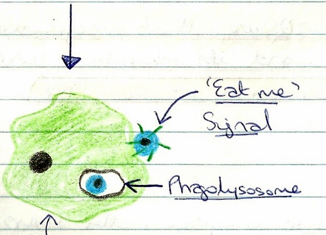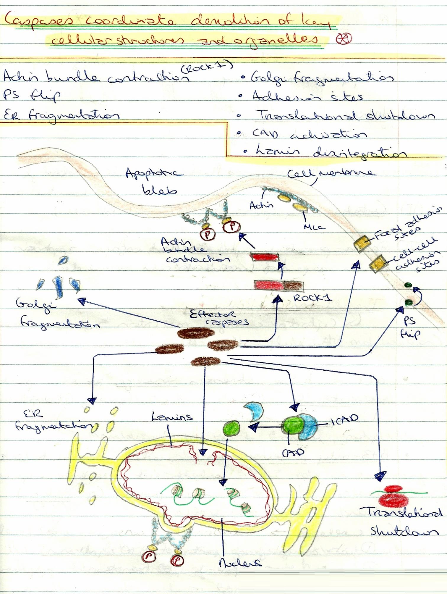 Use them to illustrate steps of a simple process e.g. my lovely blob showing the last stage of programmed cell death (above right). Move on with extra colours for more complex multi-stage interactions (below) where a single diagram can be a reminder for many pages of text and scientific papers. This type of overview is especially useful for last-minute nerves outside the exam hall.