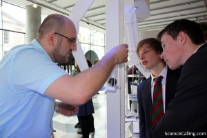Students from St. Columba’s College chatting to CRANN researcher Amir Sajad Esmaeily at the ‘Invincible & Invisible’ stand. Magical Materials consists of a number of interactive stands. The materials are often very small and look quite ordinary to the naked eye. A quick demonstration reveals the extraordinary properties that lie within.
